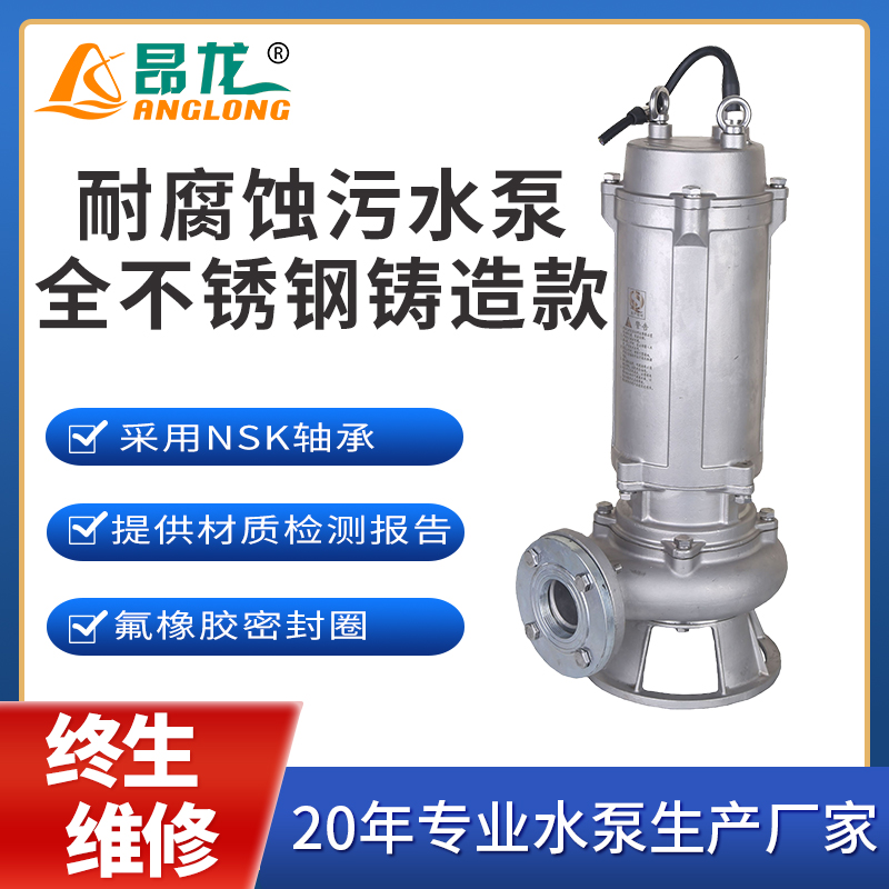 小型不锈钢潜水污水泵是电机与水泵同轴一体潜入介质中工作的水利机械,整体机壳采用不锈钢材质,耐腐蚀性强、选材精良、结构先进、过流通道宽阔、排污能力强。适用于输送含有酸碱成分的污水,例如楼房废水、化工厂污水、食品厂、海水处理等等。