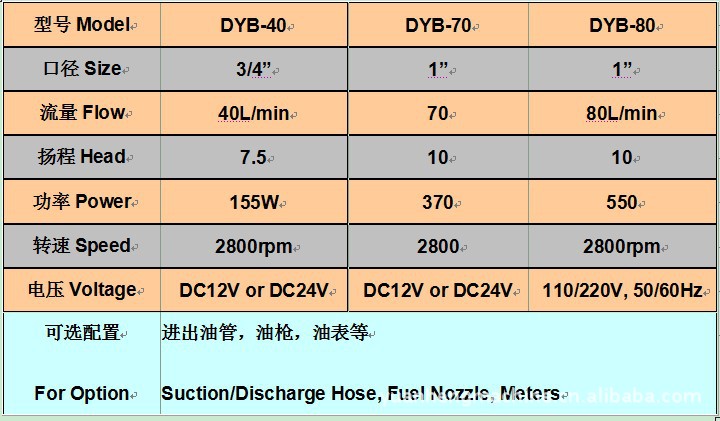 1、用于柴油,煤油,禁用汽油。 2、DYB-70直流电动油泵是基于DYB-40直流电动泵的原理,最大流量可达70L/min 3、内置溢流阀,工作间隙:30分钟 4、广泛应用于油桶抽油,建筑工地给大型机械加油,轮船,农场等。 5、自吸式叶片泵,铸铁泵体,体积小,重量轻,安装使用方便。 |