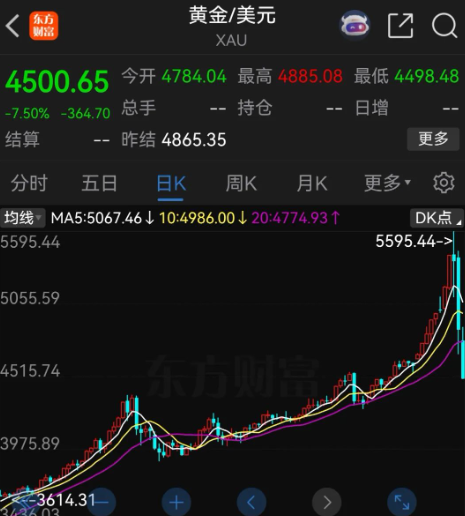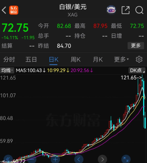 现货黄金向下跌破4500美元/盎司,日内下跌7.5%。现货白银日内跌幅超14%,近一个月涨幅已抹平。