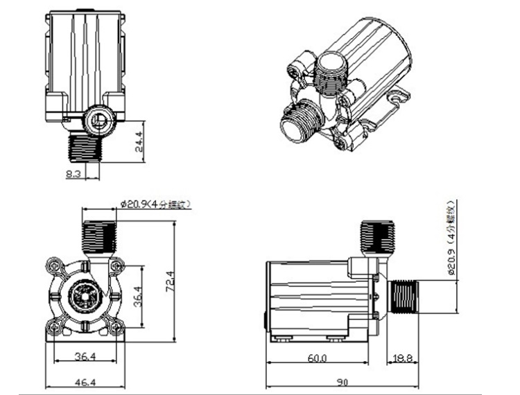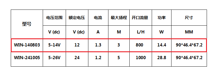 电压12V,功率14.4W,电流1.2A,每分钟抽水13升,水压3KG,扬程达3M,泵壳采用德国进口工程塑料PA66+30%玻纤,抗摔耐用,泵体采用环氧树脂密封灌胶,水电隔离,完全防水,防漏电,更安全,四分螺纹接口,常规实用,可以匹配不同规格的软管