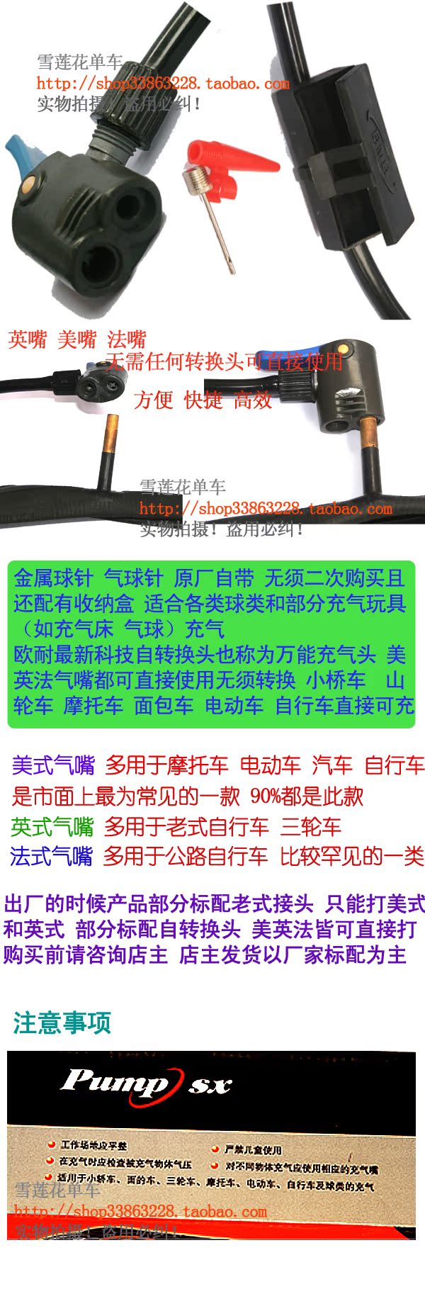 本品适用于:自行车 三轮车 助力车 汽车 摩托车 小拖拉机 球类(足球 排球等)气球等充气类玩具(原装自带转换接头,无需二次购买)