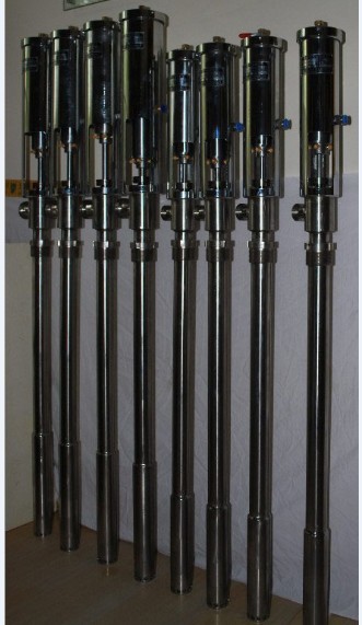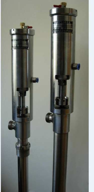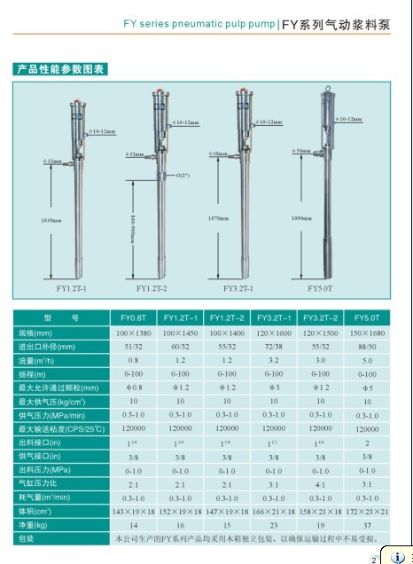 FY系列气动浆料泵(简称:气动油桶泵,又名:气动插桶泵,气动泵,气动活塞泵,气动柱塞泵,气动浓浆泵,气动往复泵,气动打胶泵、气动抽液泵,气动防爆不锈钢泵,皮革喷浆泵)【用途】气动浆料泵应用于人造革、移膜革、压延革、彩涂板、印染、医药、涂层、化工、纺织、喷漆、喷涂、薄膜镀铝、彩钢瓦等行业。适用于高粘度(VIS)≤12万CPS/25℃的化工浆料输送,具有防爆耐腐防沉淀、低噪音、节能等功能。是理想的移动输送设备。【结构和原理】 FY系列气动浆料泵采用气压差的作用,使活塞上下运行,带动导料活塞开闭,起到提料的作用。调整给气动浆料泵工作气体的流量与气压来控制和调节气动浆料泵送料流量。结合感应开关能使之自动化工作。【使用方法】1、先将导料管正确放入所要输送的料桶内。2、将耐腐蚀软管连接出料口接至送料地点。