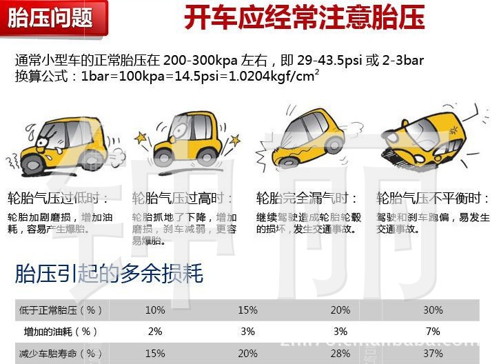 一般汽车轮胎要求压力约为2kg/cm2-2.5kg/cm2(28-36Lb/in2),使用时必须参照汽车厂或轮胎厂的标准,充气时不可超过标准或过饱,以策安全。