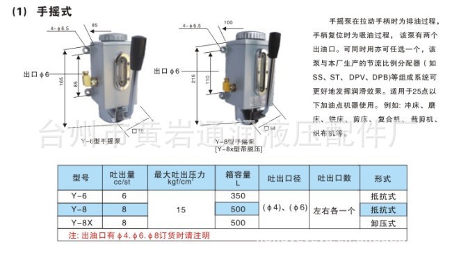 手摇泵在拉动手柄时为排油过程,手柄复位时为吸油过程,该泵有两个出油口,可同时使用也可任选一个使用。该泵与分路器组合使用可更好的发挥润滑效果,适用于加油点的机床使用,例如:冲床,车床等。