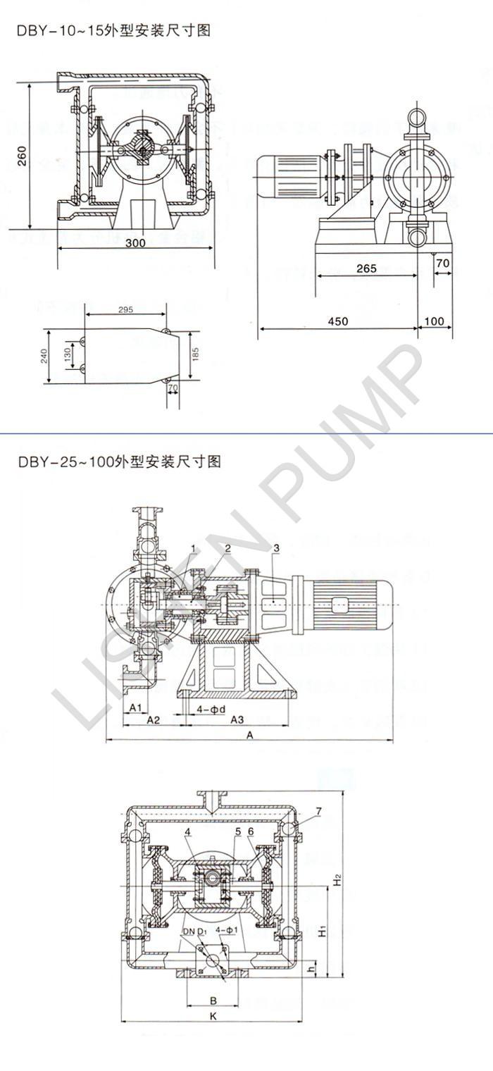 6.DBY型衬氟电动隔膜泵振动极其轻微,一般情况可不装底脚螺栓。