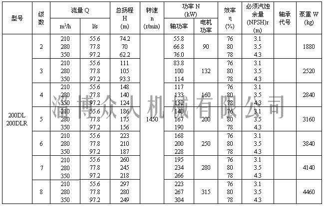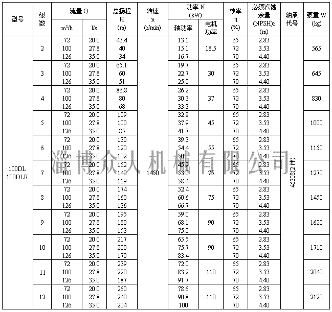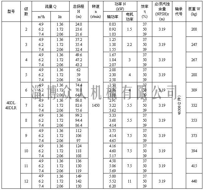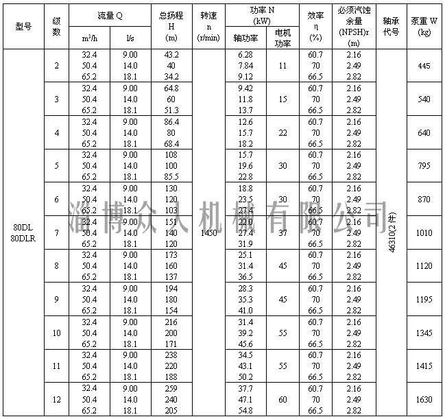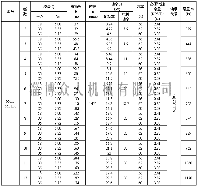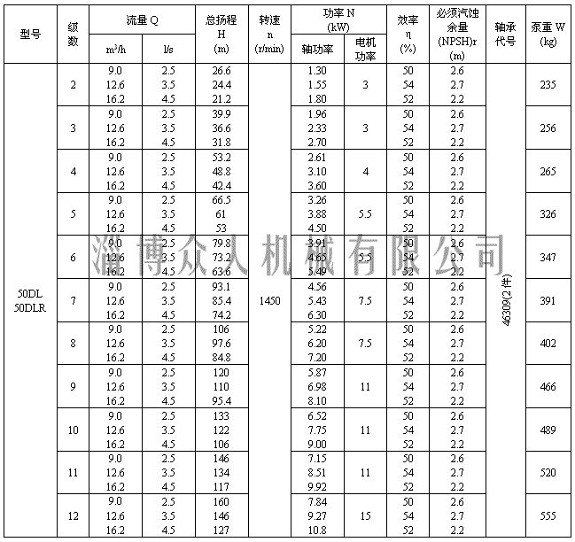 二、淄博众人机械有限公司DL多级离心泵性能参数表