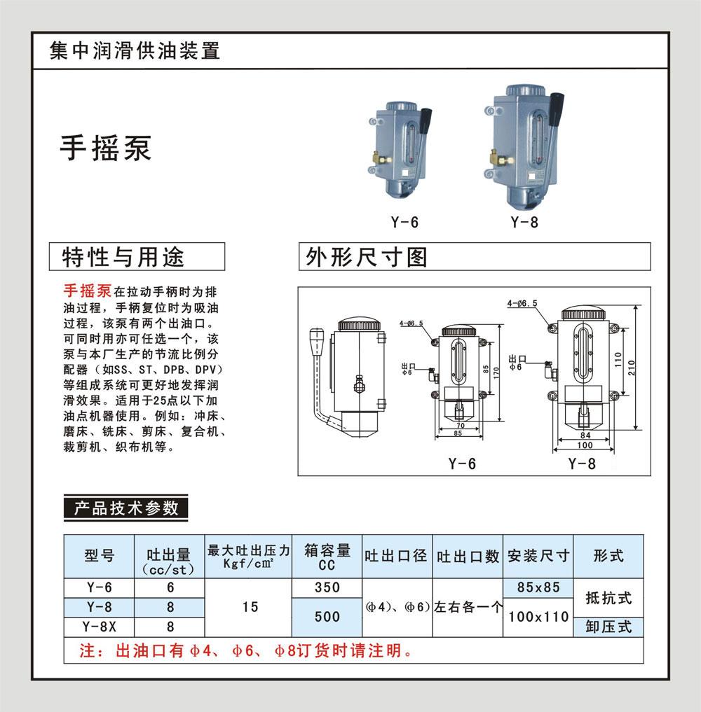 2、产品特点:Y-8是一种柱塞结构手动泵,该泵的压力较高,油罐容积:0.6L。工作原理:用手拉动手柄时,推动柱塞将存于油缸内的油液排出;当松开手柄时,柱塞在弹簧力的作用下吸油。适用范围:该泵可与节流式分配器组成润滑系统。建议使用油液黏度为N20-N1000。注意事项:该泵的出油口有三种方式~左(代号为L)出油口,右(代号R)出油口,左右双(代号S)出油口。