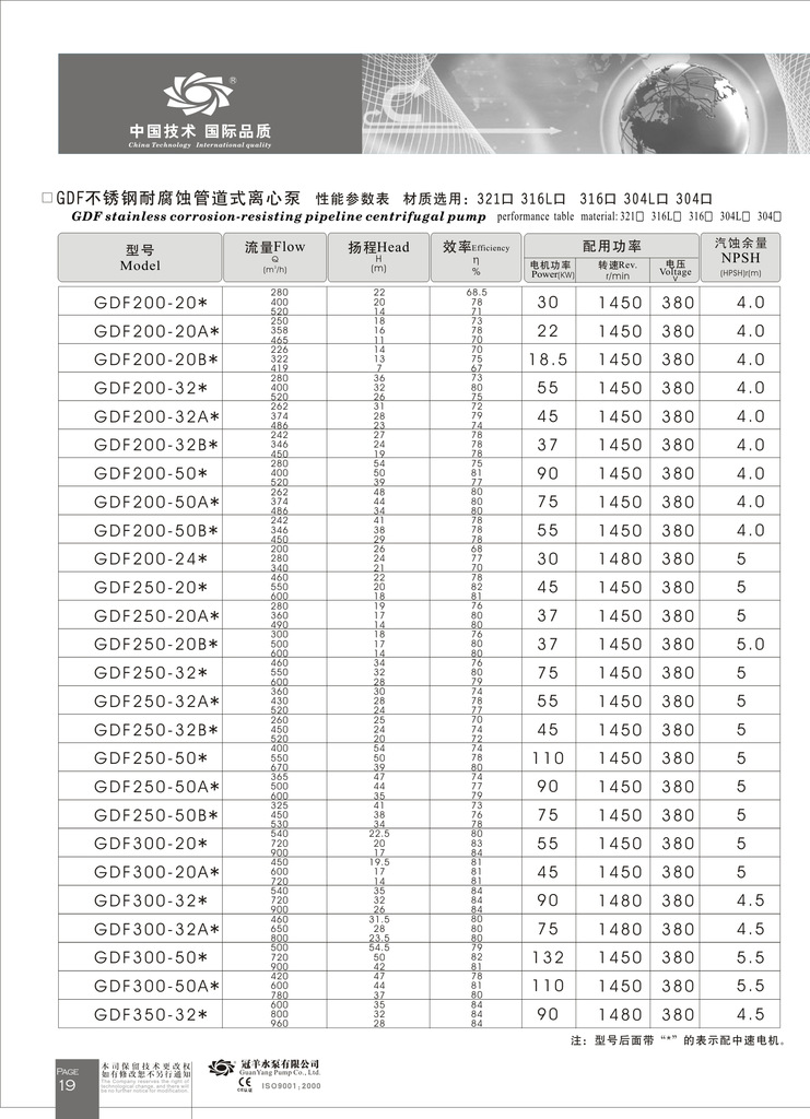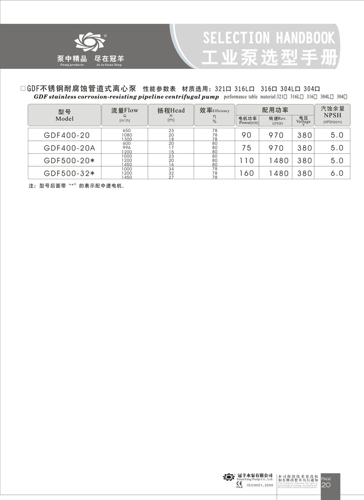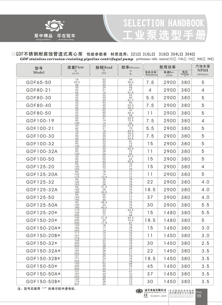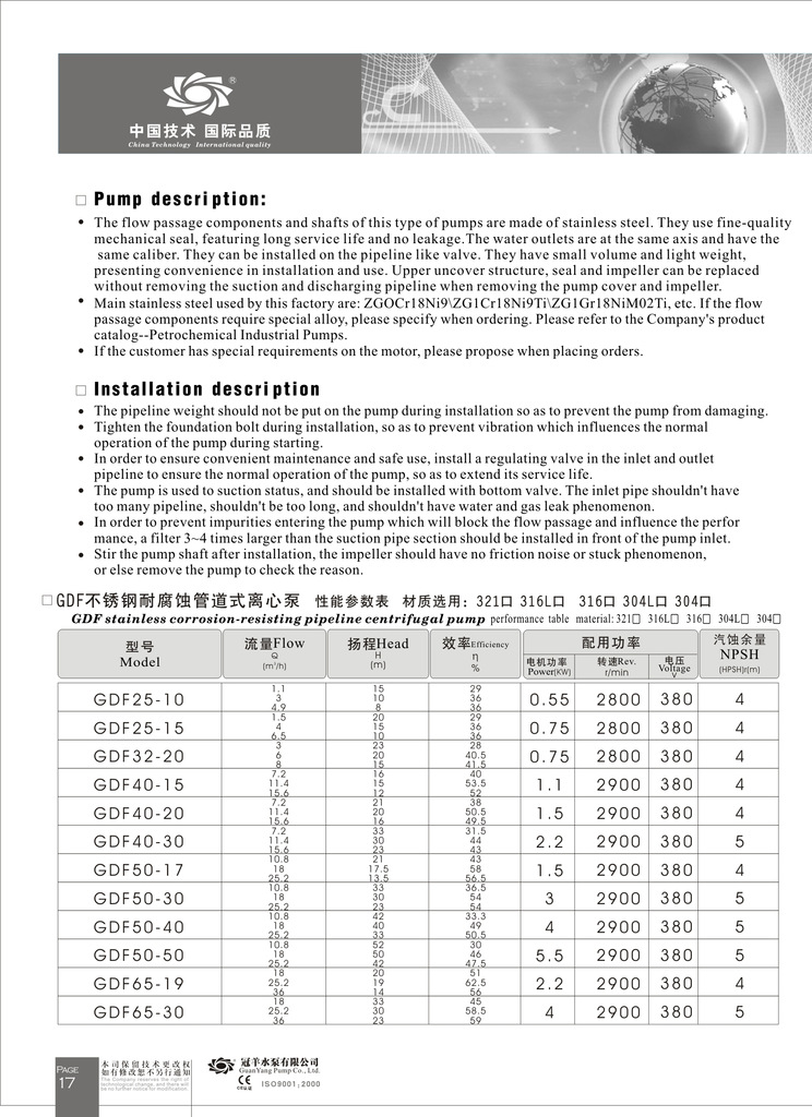 GDF型耐腐蚀管道泵过流部件和泵轴采用不锈钢制造;并采用优质机械密封,寿命长,无泄漏。