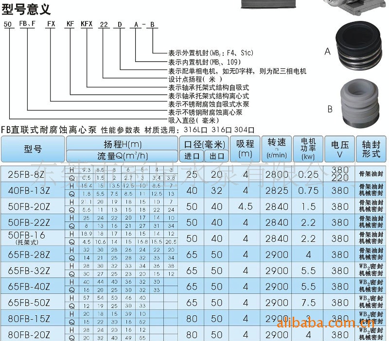 FB不锈钢直联式防爆离心泵适用于输送有一定腐蚀性的液体,清洗系统,食品加工,医药卫生,污水处理,电镀漂染,精细化工及环保工程等,或于其他设备配套使用。需防爆电机请在订货时说明。本厂0.75KW以上水泵均可配防爆电机。