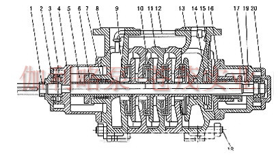 8.填料密封由进水段和尾盖上的填料室,填料压盖,填料环及填料等组成,少量高压水流入填料室中起水封作用。填料的松紧程度必须适当,不可压的太紧,也不可太松,以液体能一滴一滴地渗出为准。如果填料太紧,轴套容易发热同时耗费功率。填料太松,由于液体流失要降低水泵效率。